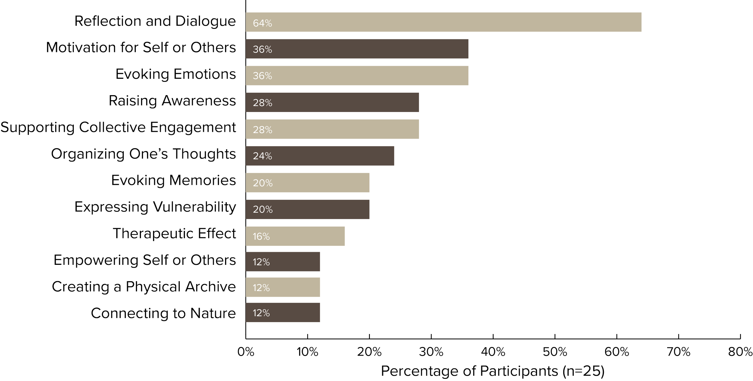 For most participants (64%), making art provided an opportunity to reflect on their experiences and memories and then share that reflection with others through dialogue. Many participants felt that the art process elicited emotions (36%) or memories (20%) that they may not have tapped into otherwise.