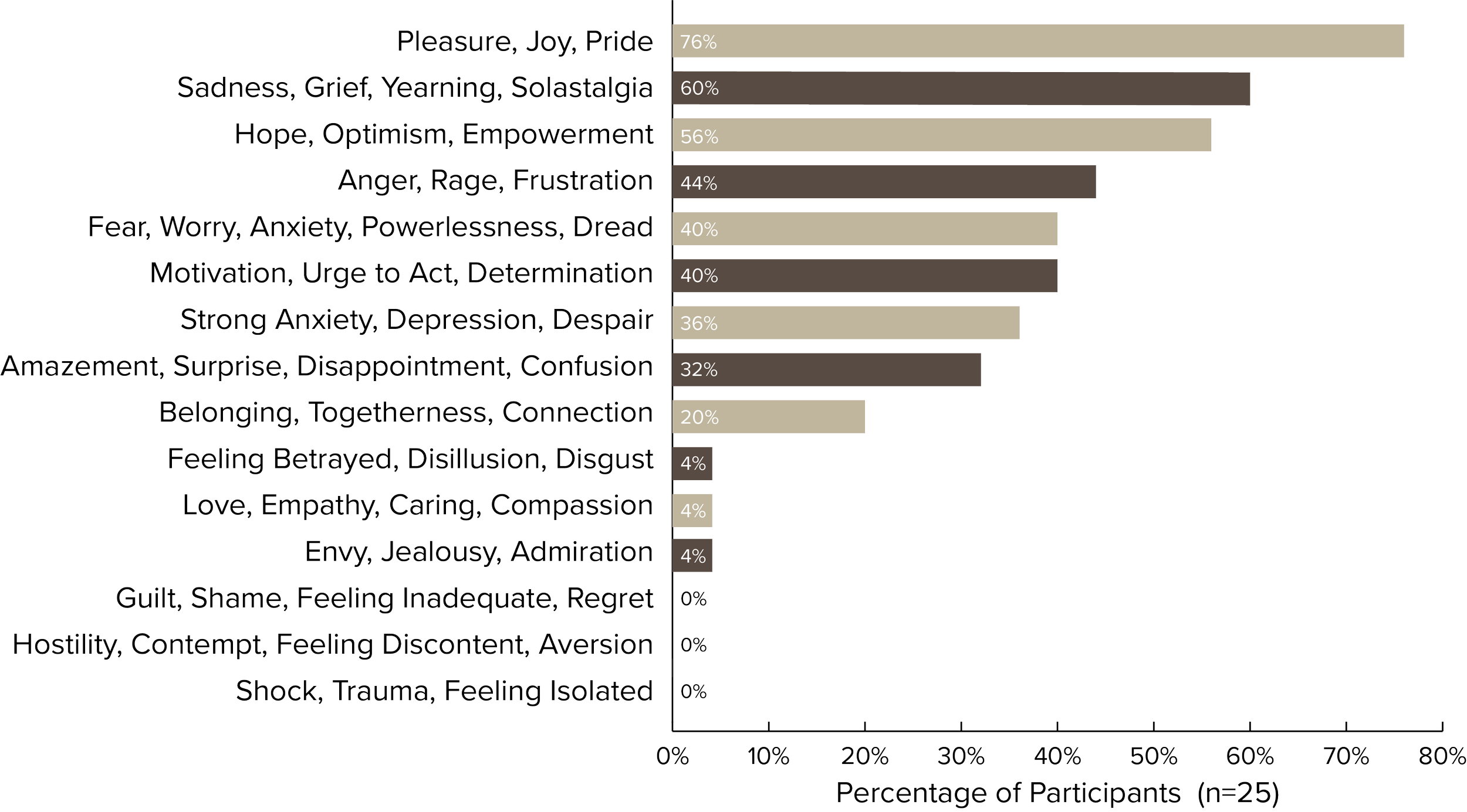Climate emotions are complex and fluid. Participants held negative emotions spanning forms of sadness (60%), frustration (44%), and fear (40%) simultaneously with many positive ones. While a majority of participants shared feelings of sadness (60%), conversations gravitated more towards positive emotions including joy (70%) and optimism (56%).