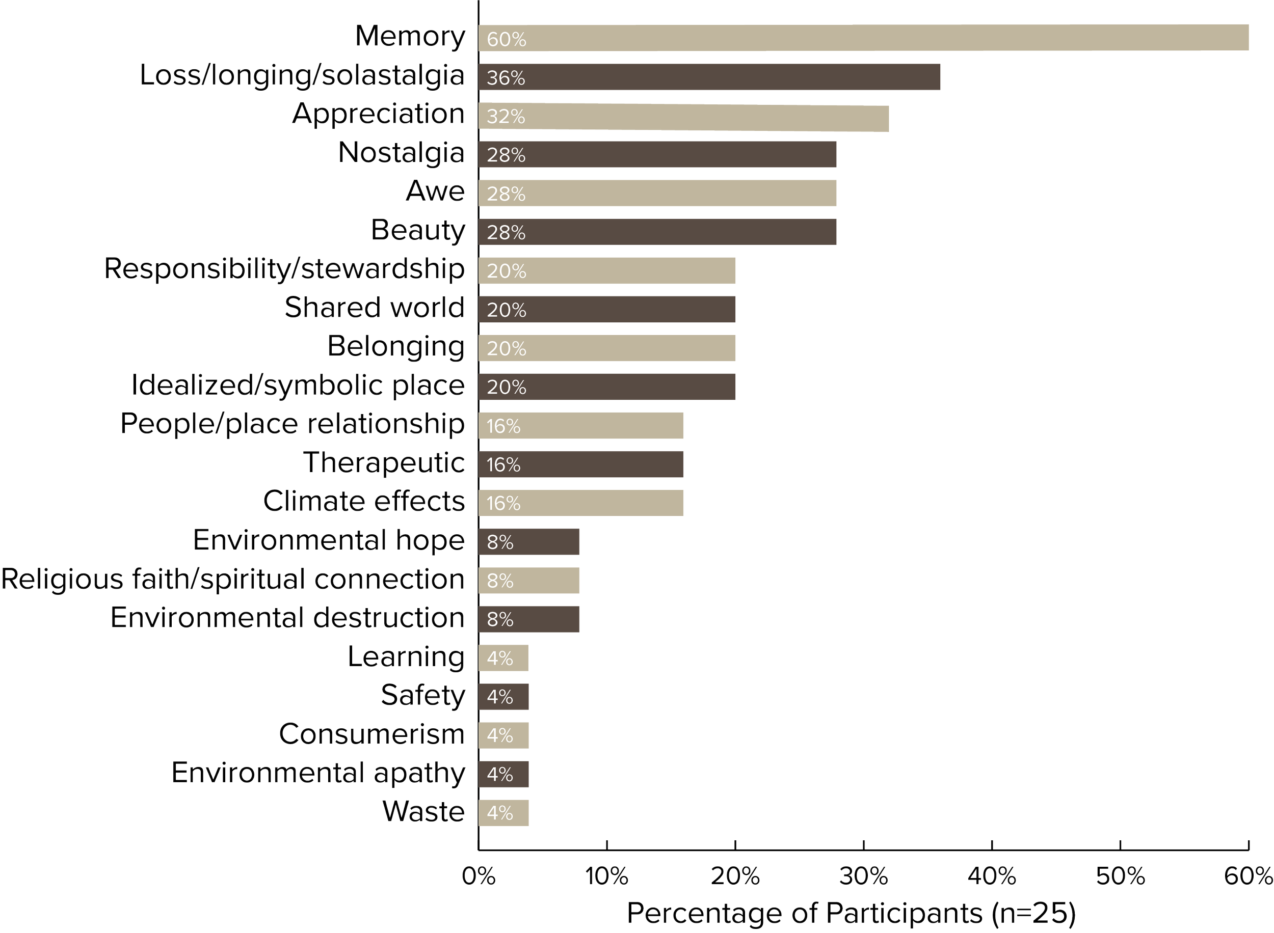 Many participants described their artwork as an expression of feeling grief and ongoing loss due to climate change (32%) or simply nostalgia (28%). For some, their artwork conveys a sense of appreciation (28%) or awe (24%) for aspects of nature, while others wanted to highlight nature’s aesthetic qualities (24%) or emphasize the environment as part of our shared world (20%) and responsibility to care for this world (20%).