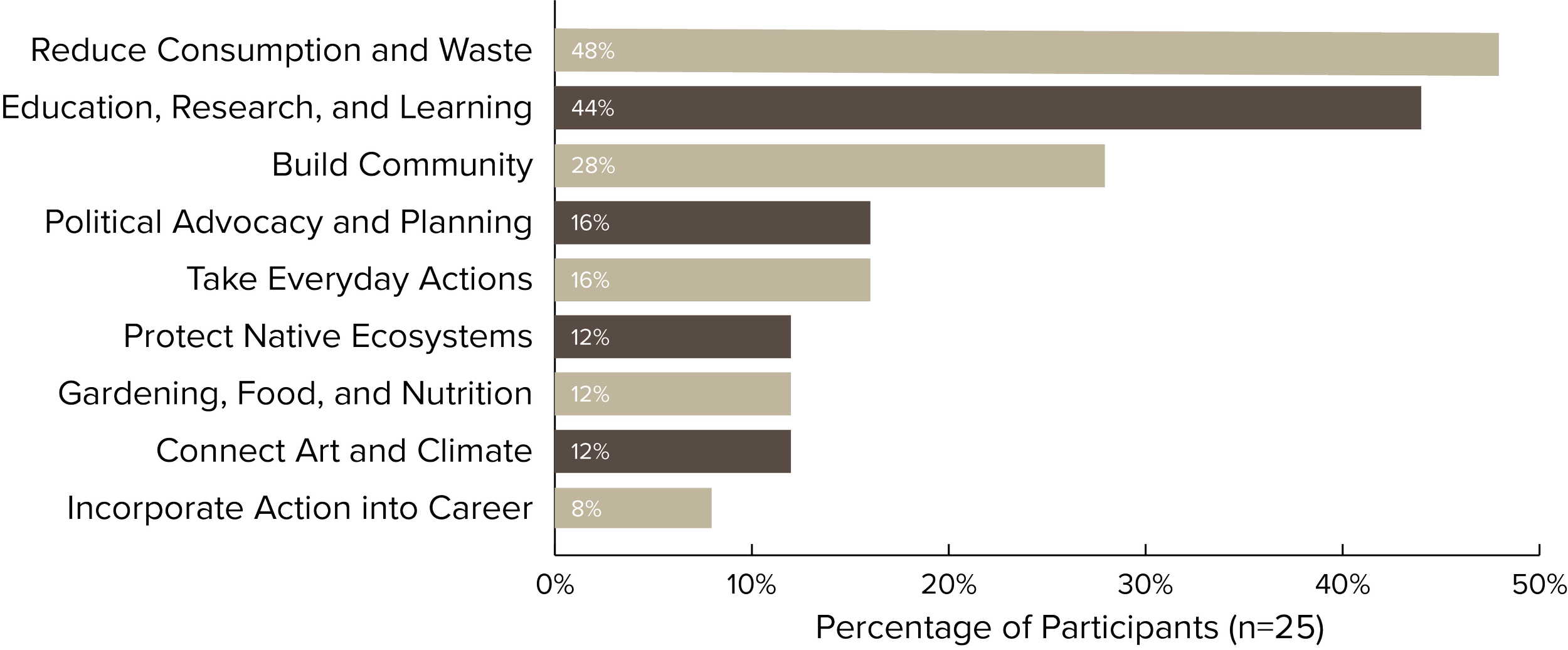 The three most common climate action responses fell into the following categories: reduce consumption and waste (48%); education, research and learning (44%); and building community (28%).